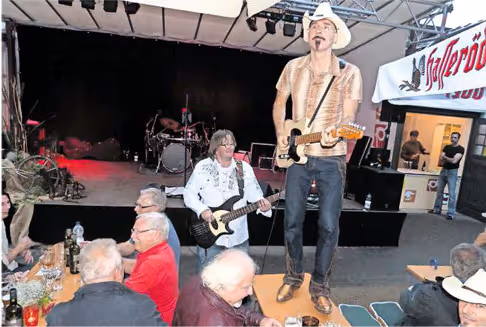 SARSTEDT. Der Hüftschwung von Frontmann „Gene“ hätte John Lee Hooker gefallen. „Shake it Baby, shake it“ zischt der Sänger von der Bühne herunter, und nichts mehr hält das Publikum auf den Bänken. “Wildes „Hey-Ho“ schallt aus dem Biergarten hinterm Haus am Junkernhof. „Gene“ geht in die Knie, springt in die Luft, packt die Gitarre fester: Mit rockiger Country-Musik und toller Bühnenshow brennen die vier Vollblutmusiker von „Blue Steel“ ein Feuerwerk ab, das die kühlen Temperaturen unterm Blätterdach schnell vergessen lässt.