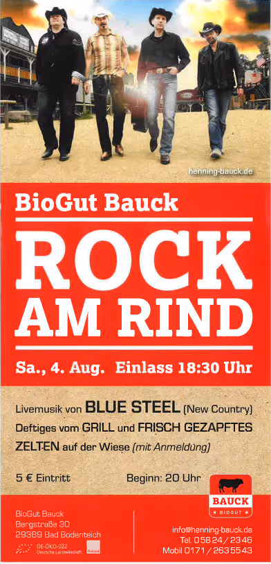 Der Name ist Programm: “Rock am Rind” am Samstag den 04. August 2018 sind wir ab 20:00 Uhr live auf dem Biogut Bauck zu Gast.